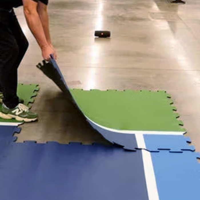 Consists of interlocking tiles that are designed to create a temporary or permanent pickleball court installation. The tiles are offered in two sizes: standard/regulation and a mini option for tighter spaces or portable play. The easy-to-install system can be set up by just four people in as little as two hours.