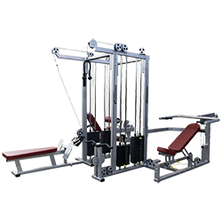 When versatility is a necessity and floor space is at a premium, the Legend Fitness Four Stack Jungle is the finest example of American-made weight training equipment. Features include a frame developed using 3D CAD software to use as few bolts as possible. This entire piece only has 16 frame bolts, resulting in a structure with high rigidity, low liability and almost nonexistent maintenance. Pin select weight stacks allow users to make quick changes in desired lifting weight, with reduced liability compared to free weights, and are compactly located within the central tower structure. Four exercise stations are at each corner of the tower: Multi Press chest and shoulder bench with 200-pound stack, Bicep Curl/Tricep Pulldown with 150-pound stack, Lat Pulldown/Seated Row with 200-pound stack, Leg Extension/Leg Curl seat with 200-pound stack.